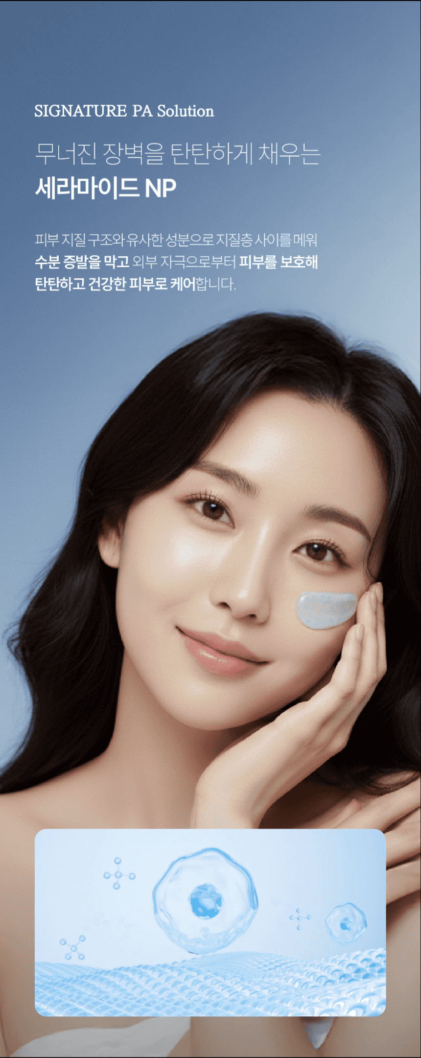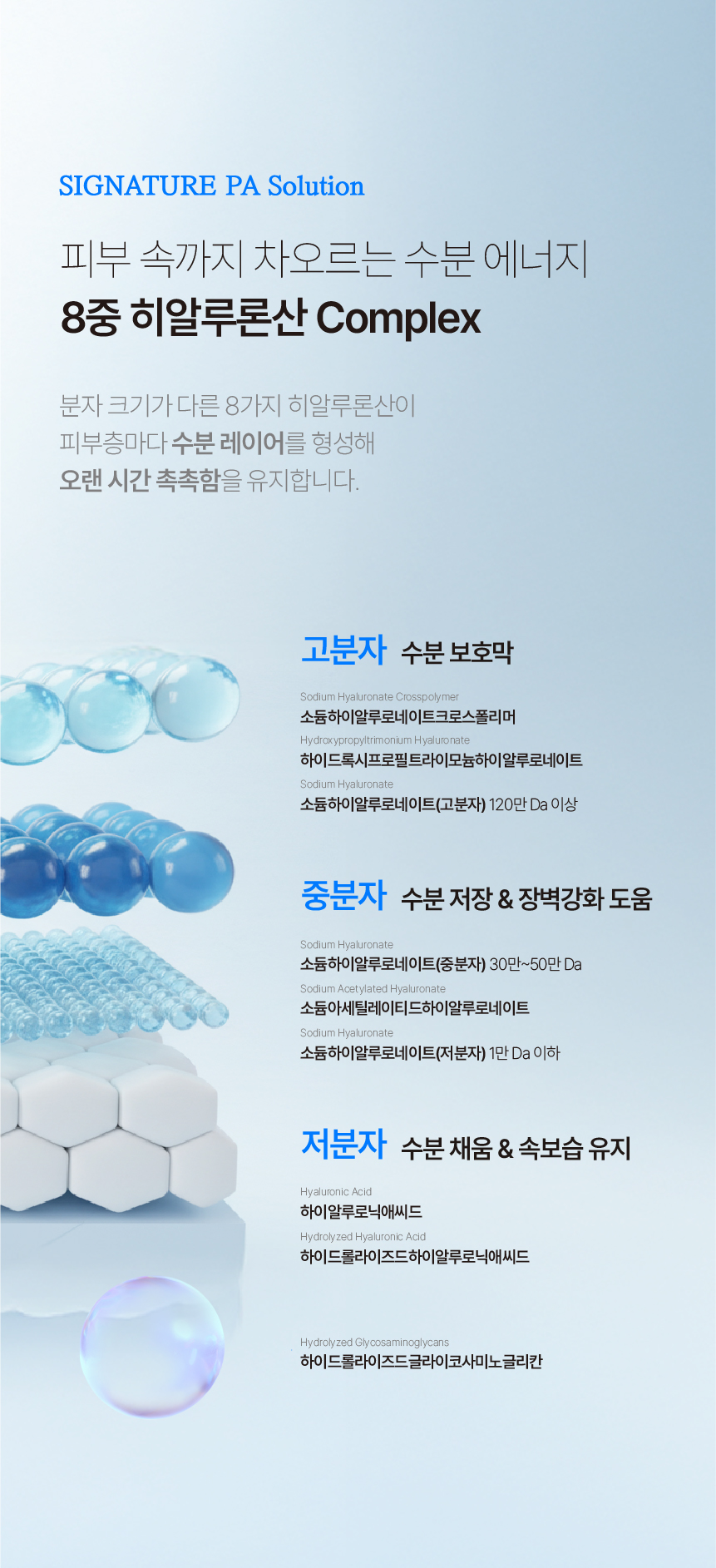 콜라겐, 히알루론산 성분이 보습 및 진정 작용으로 피부를 매끄럽고 속부터 차오르는 듯한 촉촉함과 윤기를 더해주는 고보습 솔루션